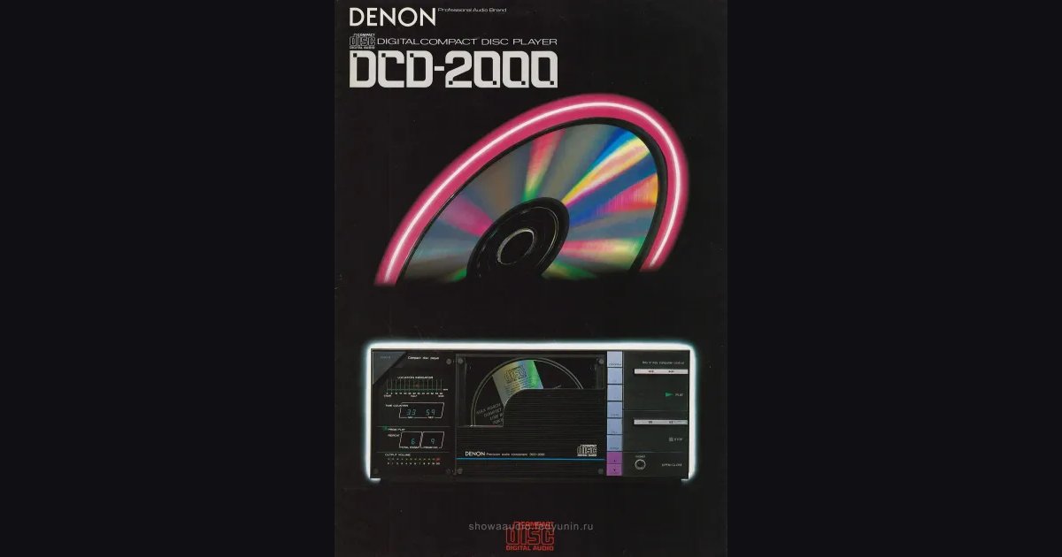 Catalog for the first DENON CD player, the DCD-2000 - released in September 1982, right in time for the official launch of the Compact Disc format in Japan on October 1, 1982. The booklet covers 16-bit linear quantization at 44.1 kHz, an optical pickup with independent 2-axis objective lens drive, RAM-based correction of resistor deviation in the D/A converter, and a DC servo direct-drive motor for the disc - carried over from DENON’s analog turntables. The back cover lists the first batch of CDs from DENON Columbia (10 titles, C37-7001..C38-7010): Beethoven and Dvořák with Karajan, Mozart, the Max Roach Quartet’s “Live in Tokyo”, Billy Harper, and PCM “Aranjuez”; the DCD-2000 itself was priced at ¥189,000.