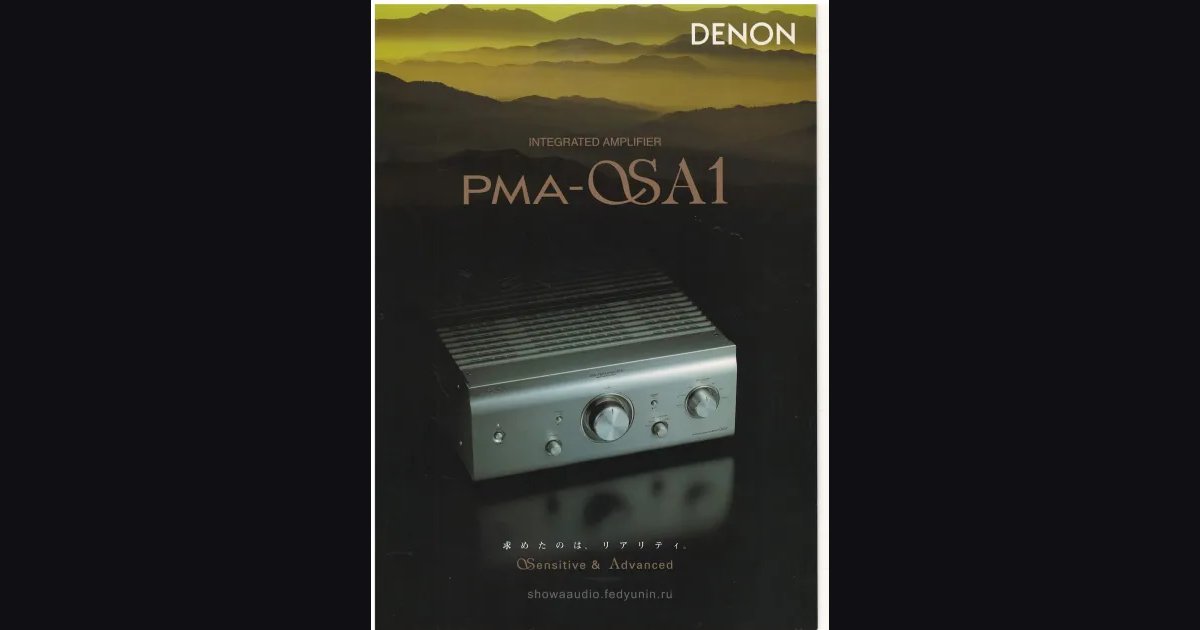A 6-page fold-out brochure for the DENON PMA-αSA1 - the successor to the PMA-αS1 twelve years on, now under an extended series name: αSensitive & Advanced (spelled out right on the cover). The unit looks visibly different: the 1990s gold front panel has been replaced by a silver-titanium finish, the heatsinks are exposed on top, and the graphics are cooler and more austere. The cover places the unit against green-gold mountains in morning mist - the αSensitive nature-photography language is still there, just with a colder palette. The new slogan reads “求めたのは、リアリティ” - “what we sought was reality” - and the spread inside adds “the true value of audio asked of in the multichannel era” (a quiet remark that pure stereo in 2006 is a deliberate choice in a market overrun by AV receivers). The circuit lineage from the αS1 of 1994 is direct: the same UHC-MOS Single Push-Pull output stage and the same INVERTED Σ BALANCE Circuit as the signature balanced topology. New in 2006: cascode bootstrap connection for the UHC-MOS (unlocking the potential of the large-current devices), a fully balanced amplifier from input to output, Precision Signal Ground with CD direct mode, a premium 50-type volume potentiometer in a brass housing, and a large-current Lc balanced series relay for the input selector. The chassis is a super-rigid construction with a 6 mm aluminium top plate, a precision-cast front panel and multi-layer heavyweight insulator feet. Connectivity gains a NETWORK input (a nod to the network-audio era) while keeping PHONO MM, BALANCED XLR, CD, TUNER, SACD/CD, DVD/VCR, two TAPE loops with REC OUT and two SPEAKER pairs. The numbers: 50 + 50 W into 8 Ω (same as 1994), but THD drops from 0.007% to 0.005%, SNR is 105 dB on LINE and BALANCED, weight is up to 30 kg (from 25.5 on the αS1), depth 508 mm. Price ¥400,000 before tax - exactly the same as the αS1 in 1994, twelve years on: DENON holds the flagship price, but for the same money delivers a heavier, more refined and more contemporary machine.