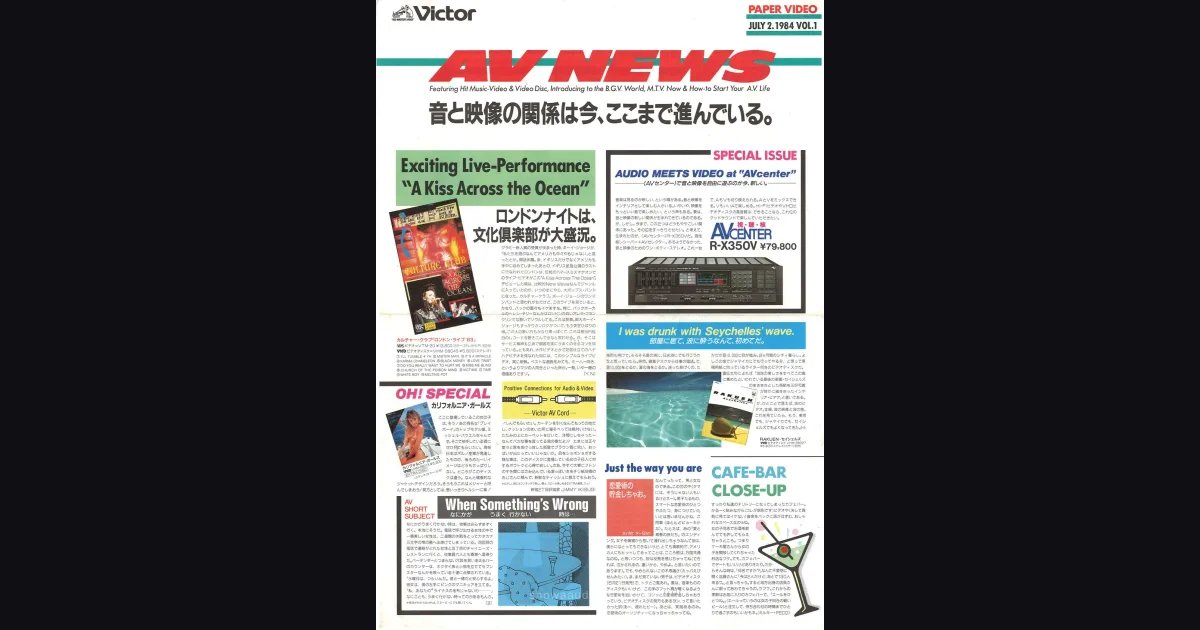 A promo newspaper from Victor about new releases on cassette and video disc - the intermediate format before DVD. Volume 1, dated July 2, 1984. Four A3-format pages. The main product push is the VICTOR R-X350V AV center - essentially an amplifier, equalizer and tuner with multiple inputs for various devices and TV/speaker outputs. Covers M.T.V. and B.G.V. (Back Ground Visual) as new home video formats, recommends Zero-MP5 and Zero-AV3 speakers. The last page shows four AV system configurations with full option sets.