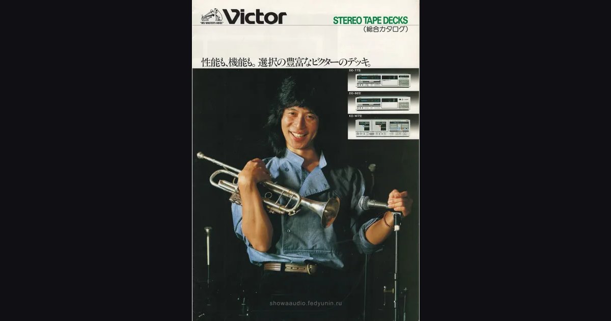 Victor stereo tape deck catalog from January 1982. Tiger Okoshi - a rising jazz star in America with Japanese roots - on the cover, his autograph inside the spread. Mostly cassette decks, but also reel-to-reel TD-5000SA and TD-4000SA. A long A4-wide foldout format. The 3-head DD-series decks with direct drive and Dolby C, slim D-E5 and D-E3 with sliding mechanisms, the dual KD-W7, plus a feature comparison table and mixers at the bottom.