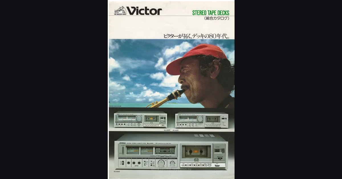 A saxophone player in a red cap on the cover, and inside a four-panel A4 foldout with Victor’s full deck lineup for early 1980s. Cassette decks from the flagship KD-A8 down to the entry KA-38, plus 10-inch reel-to-reel TD-5000SA and TD-4000SA. The inner cover tells the story of Victor’s head technology - from standard ferrite to Sen-Alloy and X-cut SA. Bottom section has compact decks, mixers, a feature comparison table and headphones.