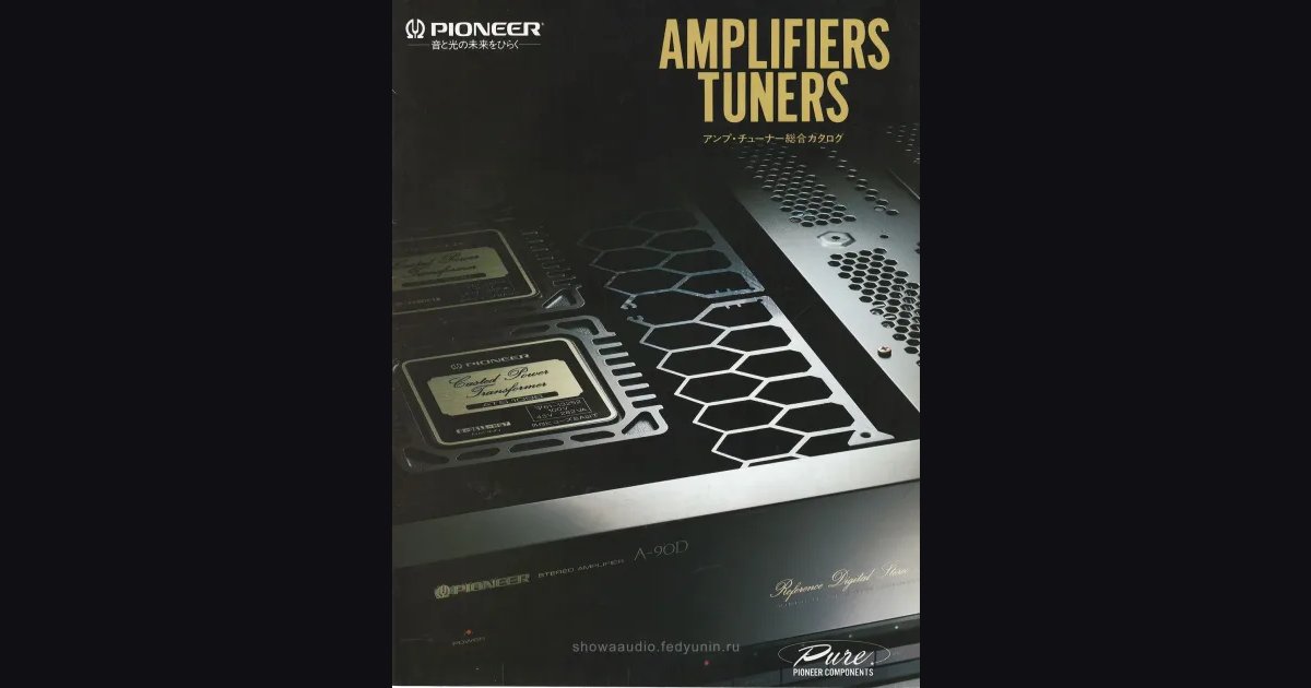 Pioneer amplifiers and tuners catalog for March 1988, under the Pure Pioneer Components banner. The EX series flagship is the PIONEER A-90D at 220,000 yen - Pioneer’s first integrated amplifier with a built-in DAC: an optical input takes signal directly from DAT, CD, or a digital tuner, and an optical delay correction circuit handles the timing offset. Direct Construction and anti-resonance chassis are part of the same engineering package. Down the lineup: A-717, A-616, and A-505 (the latter with 100W+100W, aimed at digital sources). Tuners are the F-717 with the ARTS system (0.8dBf sensitivity, 0.02% distortion) and F-505 with CCTS computer-controlled tuning. AV duties go to the VSA-700 with built-in Dolby Surround. The back cover covers accessories: EX series headphones, Pure series optical cables, and the VS-100 video selector at 29,800 yen.
