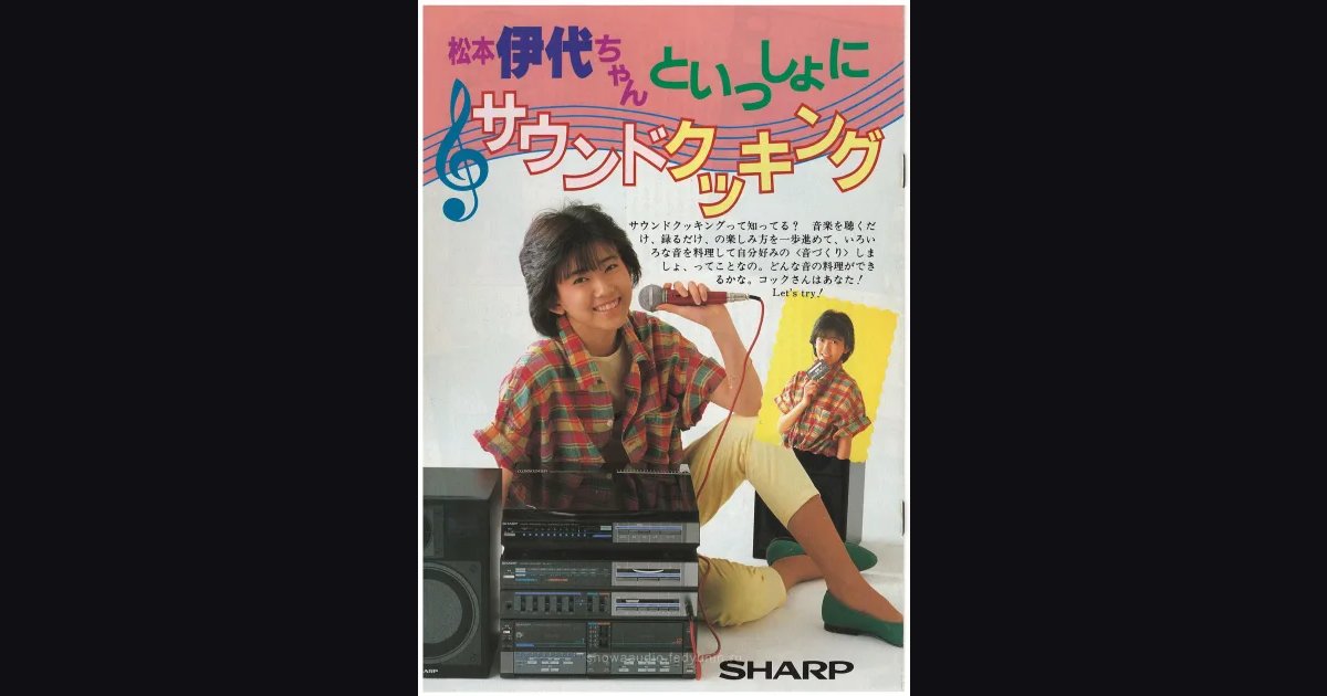 SHARP promotional booklet from spring 1984, 8 pages, featuring pop idol Matsumoto Iyo as the face of the ‘Sound Cooking’ series. Four spreads walk through different audio lifestyle scenarios - from casual listening to recording and home singing sessions. On the product side: the SHARP GV-500 CD player at 105,000 yen, double-cassette boomboxes, mini component systems, and a no-touch turntable. The back cover ties into a gift campaign running March 1 through April 30, 1984.