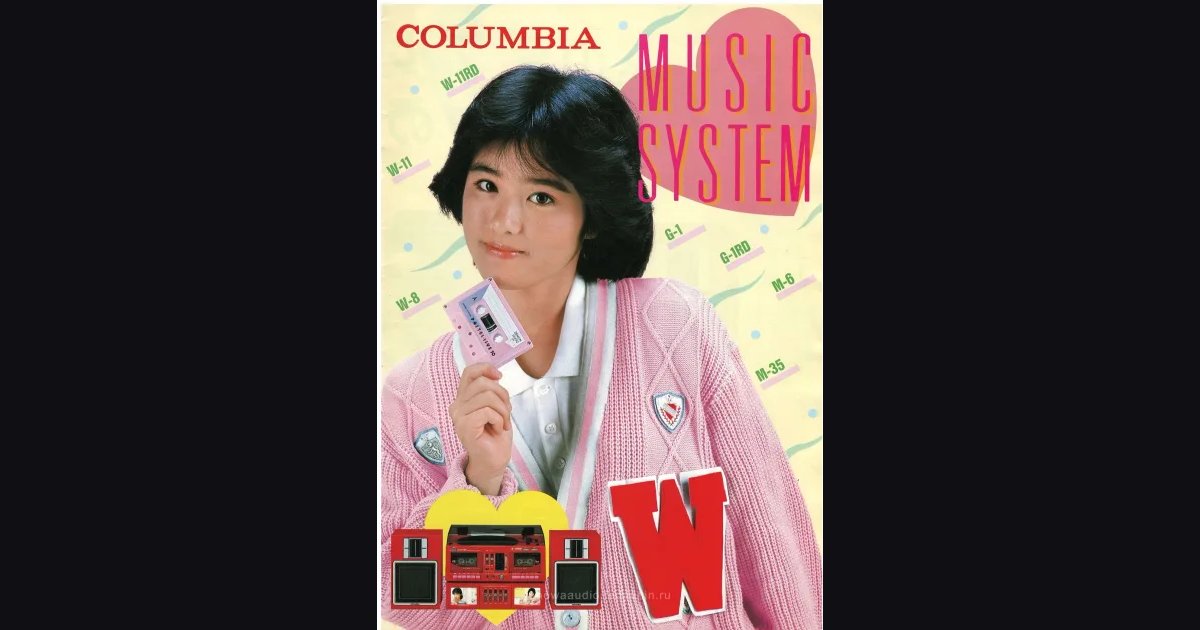 Буклет про линейку музыкальных центров COLUMBIA Music System, декабрь 1984 года. Серия W - это бумбоксы W-11RD и W-11 с двойной декой (Wデッキ) и встроенным эквалайзером, серия MY W - мини-стереосистемы G-1RD и G-1 с цифровым сенсорным тюнером и граф. эквалайзером за ¥99,800. Линейка Pair Harmony включает W-8 с двойной декой, универсальный M-35 (1台4役 - один прибор заменяет четыре устройства) и M-6 с проигрывателем пластинок. В опциях - микрофоны DM-V12RD, DM-V8B, DM-7DP, наушники и кассеты серий Parti-Live и Pocket GX.