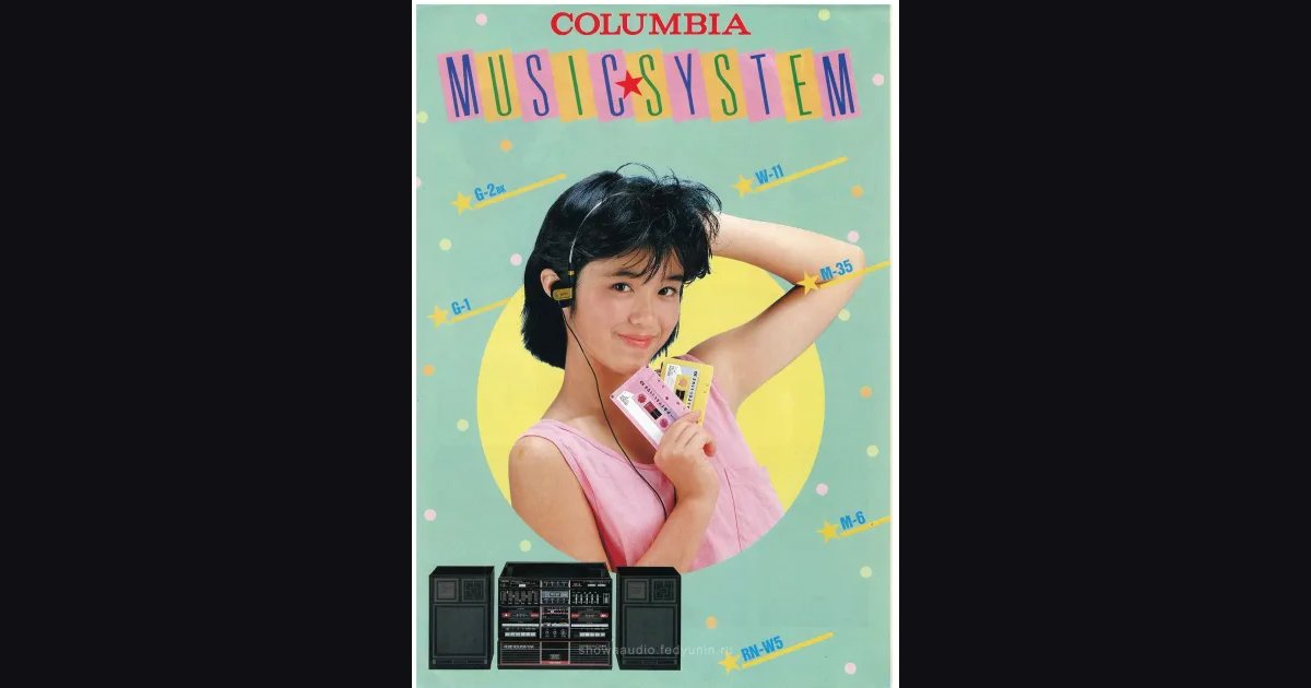 Буклет про музыкальные системы серии Music System от COLUMBIA апреля 1985 года, 6 страниц. Флагман линейки - G-2BK с двойной кассетной декой, проигрывателем виниловых пластинок, FM/AM тюнером и приёмом ТВ-звука, комплект с колонками SV-2BK за ¥94,800. Попроще - G-1 и системы серии PairHarmony (M-35, M-6), у M-35 четыре функции в одном корпусе: вертушка, дека, FM/AM радио и микрофонный миксер. Завершает линейку RN-W5 - стереомагнитола с двойной декой, позиционировалась как “всегда рядом, симпатичный дубль”. На последней странице - кассеты собственной марки COLUMBIA серии PASTEL LIVE DX1.