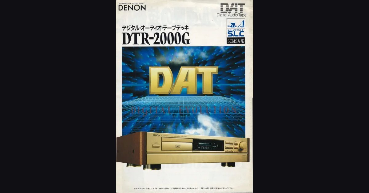 Буклет про DAT-деку DENON DTR-2000G, июнь 1990. Сам буклет сделан с выдумкой - разворот стр.2-3 с откидной нижней панелью, которая имитирует открытие крышки панели управления на плеере. DTR-2000G позиционируется как флагман с реальным 20-битным конвертером (не интерполяция) и фирменной схемой S.L.C. (Super Linear Converter), которая снижает нелинейные искажения при ЦАП-преобразовании. Цена ¥128,000. Последняя страница - рекламный блок с CD-чейнджером DCM-444G и фирменными DAT-кассетами R-120DT.