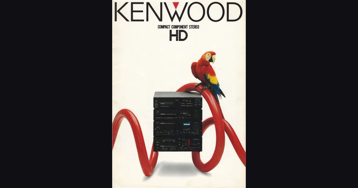 Буклет про линейку компонентных систем KENWOOD Compact Component Stereo HD, июль 1984-го. Вся серия строится вокруг идеи “HD” - High Density: два уровня систем (900-я и 700-я серии), каждая собирается из отдельных компонентов под единым дизайном. Усилители KA-929 и KA-727 с технологией DLD - два отдельных тракта для слабых и сильных сигналов, чтобы не гробить микродинамику на больших уровнях. Кассетные деки KX-727R (автореверс) и KX-727W (двухдековая) с TLLE-записью, проигрыватель KP-727 с T4P-картриджем, тюнеры KT-929/727 тоже с DLD на входе. CD-плеер DP-700 идёт как опция к большинству конфигураций. Красная спираль и попугай ара на обложке - фирменный образ кампании.