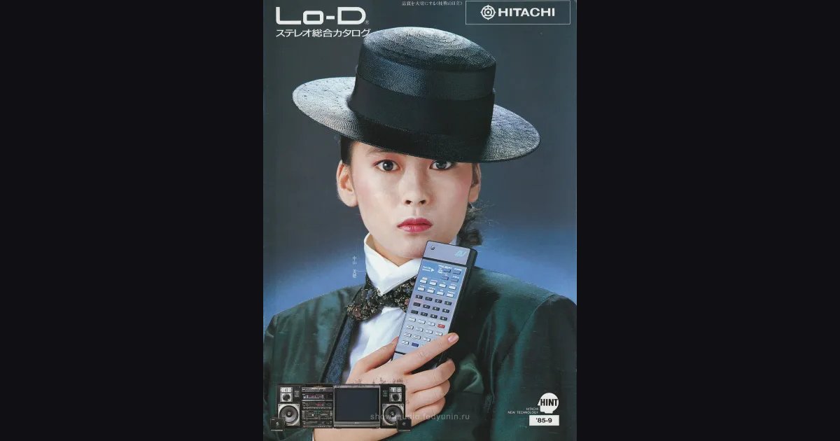 Общий каталог Lo-D от Hitachi на сентябрь 1985-го - 24 страницы, три серии систем и россыпь отдельных компонентов. Главный акцент - AV-интеграция: серия Wing AV с единым пультом RB-W7, который управляет и звуком, и телевизором, и видеомагнитофоном. Параллельно идут Eagle 750 и 550N для тех, кому нужен чистый звук без видео, и молодёжная линейка Newwave. CD-плееров сразу четыре модели - от DAD-W7 за 69 800 до анонсированного DAD-W7000 с выходом в ноябре.