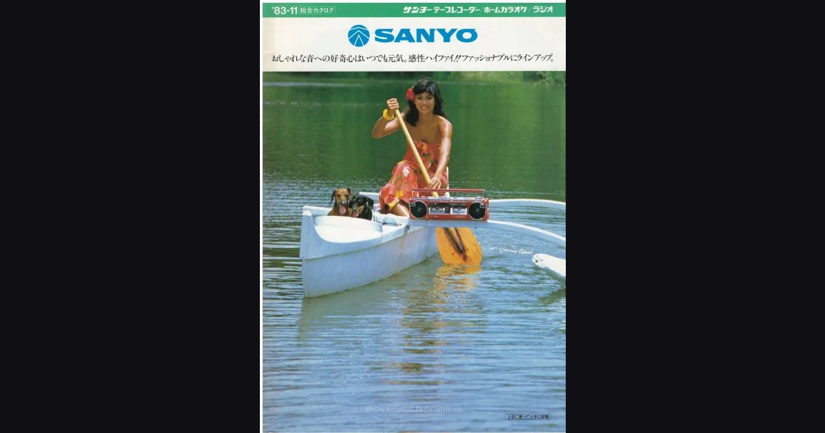 Тетрадка А4 на скрепках, 20 страниц - общий каталог SANYO за ноябрь 1983 года: магнитолы, портативные плееры, домашнее караоке и радиоприёмники. На обложке японская девушка в лодке с красной магнитолой серии U4 - каталог называется Fashionable Sound U4, и эта серия занимает первую половину: от двухкассетного флагмана MR-WU4MK за ¥47,800 с записью на скорости x2 до компактного Town U4 и модели-перевёртыша, которая работает и горизонтально, и вертикально. Отдельный разворот отдан плееру MR-JJ II Body Stereo - крепится на пояс, динамики смотрят в тело, Dolby NR внутри, ¥33,000. Переносная компонентная система L5 за ¥105,000 и системы домашнего пения BIGVOCAL с флагманом PAT-120 за ¥270,000 закрывают основной контент, финал - плотная страница карманных радио и наручные приёмники La Watch.