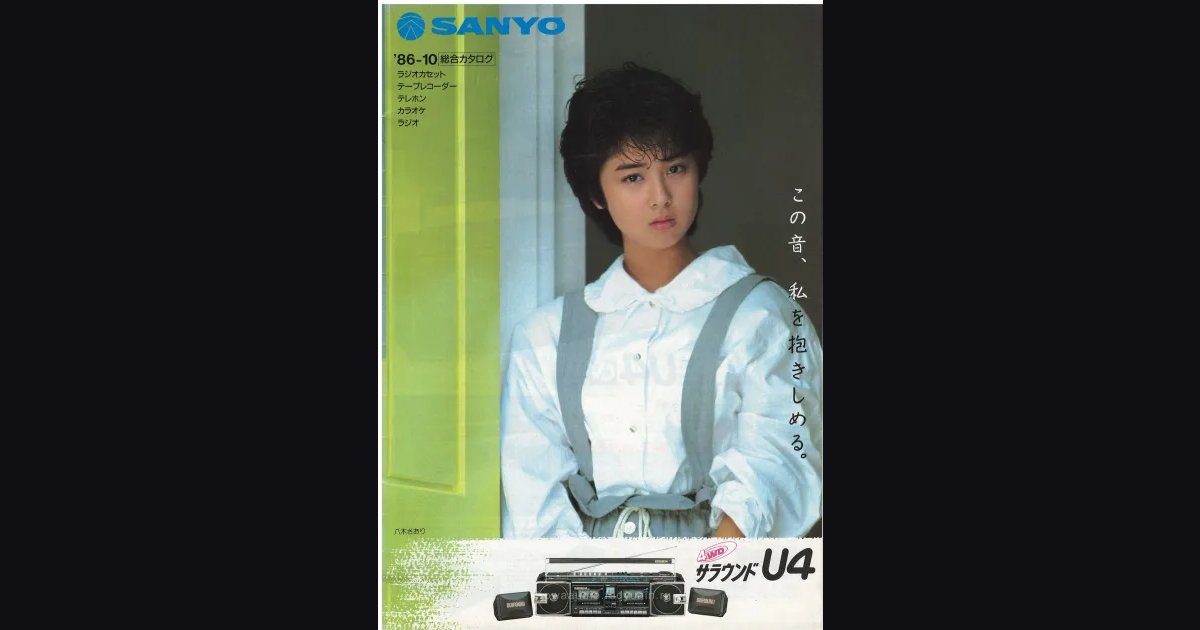 Каталог SANYO на октябрь 1986 года - 20 страниц общего ассортимента: магнитолы, портативные плееры, караоке, телефоны, радио. На обложке - японская актриса Саори Яги с флагманским бумбоксом Surround U4 и слоганом “эта музыка обнимает меня”. Главная тема выпуска - встроенный CD в магнитолах: MR-U4CD с проигрывателем компакт-дисков за ¥69,800 SANYO рекламирует как принципиально новый способ слушать любимые треки дома или в поездке. Серия 4WD Surround U4 с выносной сабвуфер-колонкой и 15-ваттным усилением занимает центральные развороты, следом - плееры JJ с TV-тюнером и монитор-спикером для тех, кто хочет слушать телевизионный стереозвук на ходу. В финале - плотный разворот с системами домашнего караоке серии PAT и страница кассетных лент собственной марки.