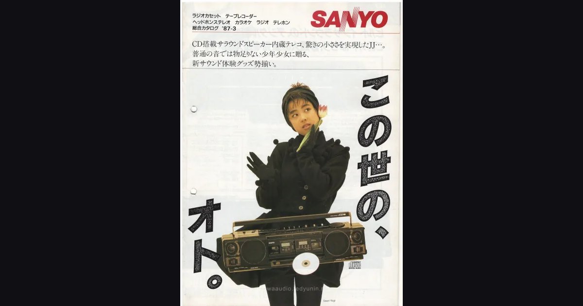 Тетрадка А4, 22 страницы - общий каталог SANYO за март 1987-го. Главный акцент выпуска - флагманская CD-магнитола w.CD3 (PH-WCD3) со встроенным сурраундом и переключением режимов одной кнопкой, а также серия 4WD Surround U4 с выносными сателлитами - у старшей UA-W990 четыре канала, два кассетника и таймер. Портативная линейка JJ обновлена под лозунгом “NEW HARD CONCEPT”: новый корпус с 23-мм мотором, вес 163 г - меньше кассетного кейса, часть моделей с TV-тюнером и монитор-динамиком. Двойные магнитолы Double U4 держат середину ценового ряда, отдельные страницы - радиоприёмникам NP, кассетам THE REVERSE, домашнему карАОКе PAT (с вокальным чейнджером PAT-K03X за ¥89,000) и телефонам серии CUTE.
