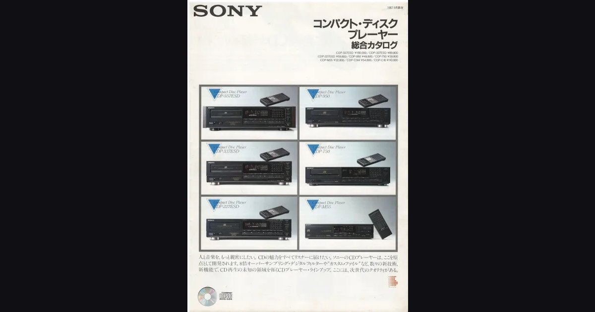 Буклет на скрепках, 12 страниц - каталог CD-проигрывателей SONY за октябрь 1987-го. Линейка разбита на три уровня: новая ES-серия с флагманом CDP-557ESD (18-бит ЦАП, 8-кратный оверсэмплинг, ¥180,000) плюс CDP-337ESD и CDP-227ESD; средний ряд с CDP-950 и CDP-750 с функцией Custom File (программируемые заметки к трекам); бюджетный CDP-M55 с пультом. Отдельные полосы занимают чейнджеры - пятидисковый CDP-C5M и десятидисковый CDP-C10 с магазинной загрузкой CD Magazine. Центральный технологический разворот с заголовком «Концепция покоя и движения» раскрывает философию нового поколения ES-серии: линейный привод каретки лазера, 18-бит конвертер и 8-кратный цифровой фильтр как стандарт нового времени.