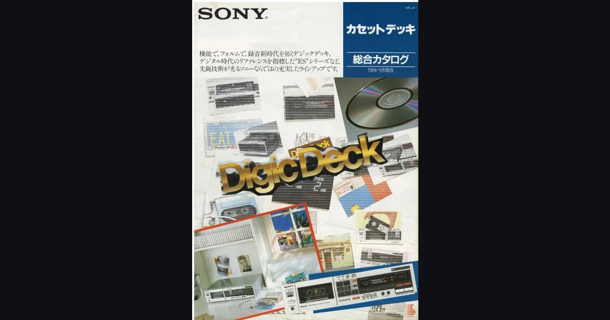 Лист А2, сложенный вчетверо, про кассетные деки SONY за май 1984 года - весь каталог под маркой DigicDeck. Три модели серии DigicDeck с автореверсом: TC-FX705 с лазерно-аморфной головкой и цифровым индикатором уровня, TC-FX707R с компьютерным управлением скоростью ленты, TC-FX606R толщиной всего 8 см с загрузкой кассеты по типу CD-проигрывателя. Разворот с ES-серией: TC-K777ES за ¥168,000, TC-K666ES за ¥120,000 и TC-K555ES II за ¥99,800. На обороте - двухкассетная TC-W30 за ¥59,800 и профессиональная TC-5550-2 за ¥248,000.