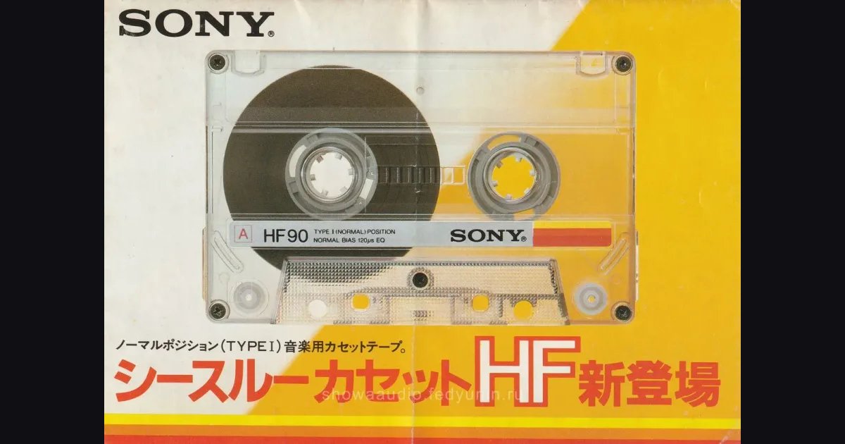 Буклет про дебют See-Through кассеты SONY HF, лето 1983-го - лист А3, сложенный пополам, с гимном тому самому “обнажённому звуку” (ハ・ダ・カの音). Внутри весь типоразмерный ряд HF (HF 30 / 46 / 60 / 90 / 120 от ¥300 до ¥900) и подробный разворот про две новинки: фирменную SD-формулу с расширенным динамическим диапазоном и Clear Dual Protection Mecha (DP312) - две независимые прозрачные шторки, параллельные пины и допмеханизм загрузки ленты ради низкого центра тяжести и стабильного хода. На задней стороне кучкой собрана вся актуальная линейка SONY 1983 года: METALLIC до ¥1,300, DUAD, UCX-S и UCX, AHF и BHF, плюс жанровые серии Rock 54, Classic 54 и Pops 54.