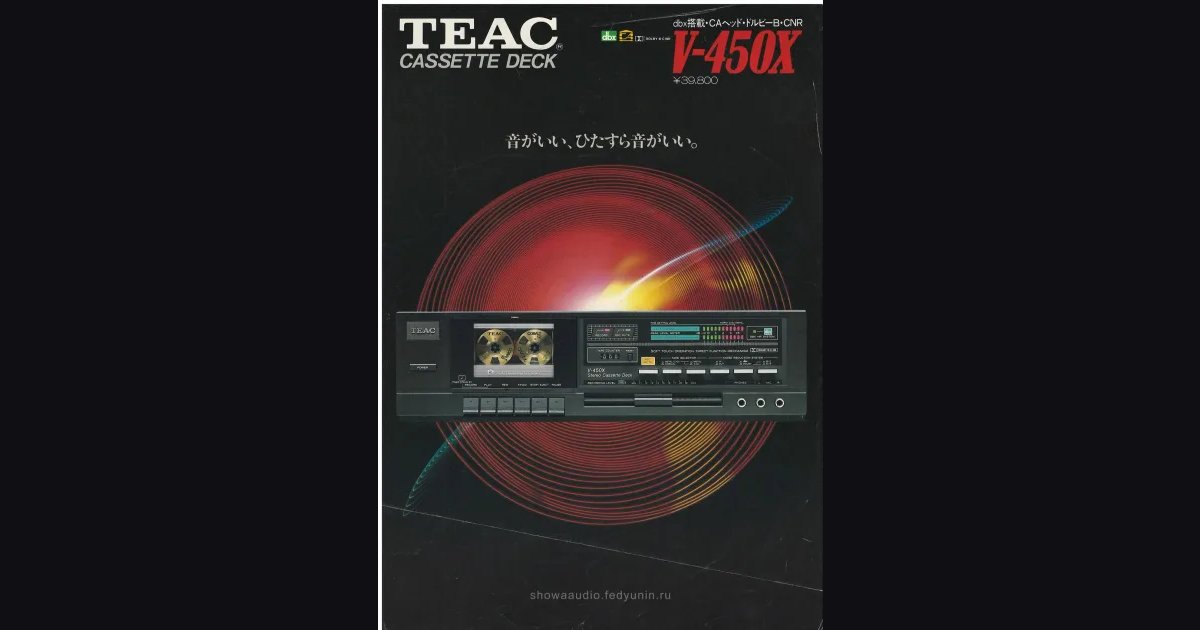 Листовка про кассетную деку TEAC V-450X, лист А4. за 39 800 иен. TEAC делает упор на CA-головку (Cobalt-Amorphous): говорят про электромагнитные свойства кобальта и аморфную структуру сплава. Плюс полный набор шумоподавления - dbx, Dolby B и C, CNR. Слоган на обложке: “Звук хорош, просто хорош.”