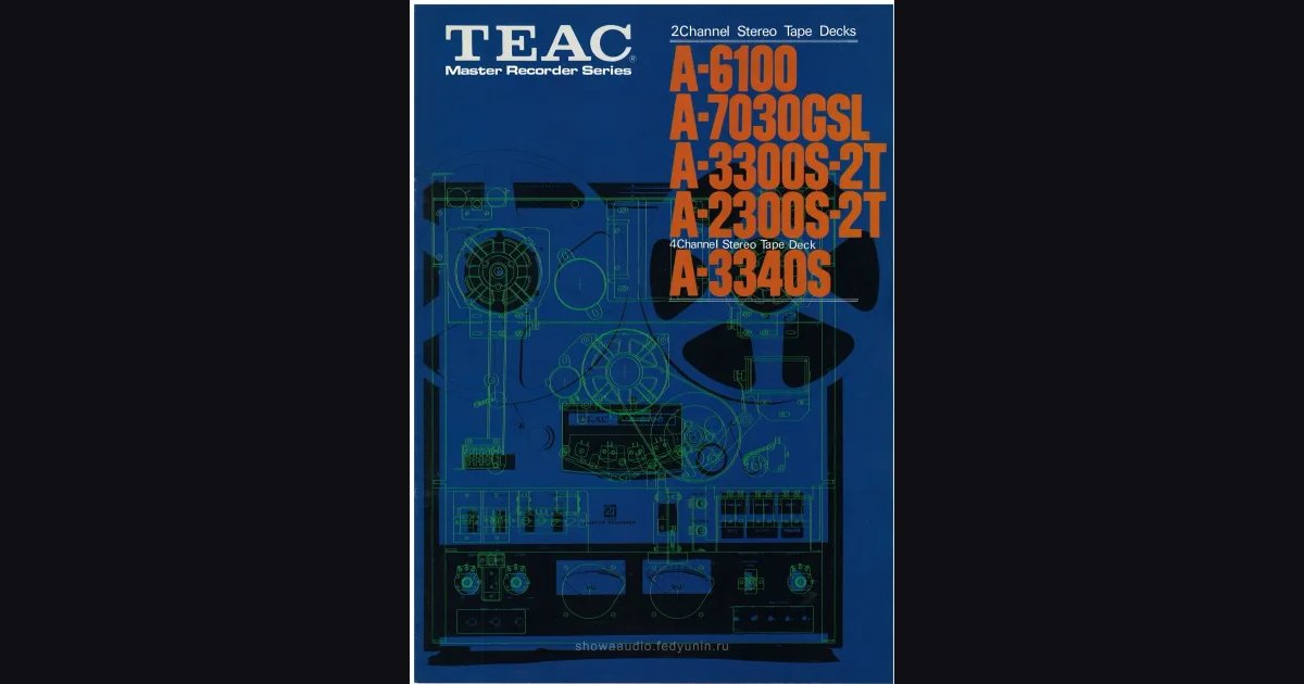 Брошюра про линейку катушечников TEAC серии Master Recorder, июнь 1974: пять моделей для профессиональной записи дома. Два разворота посвящены флагманам A-6100 (¥175,000) и A-7030GSL (¥225,000) - 2-дорожечным деком со скоростью 38 см/с и фирменным потенциометром White Ring в микрофонном входе. Третий разворот отдан A-3300S-2T (¥140,000), A-2300S-2T (¥100,000) и четырёхдорожечному A-3340S (¥248,000) с технологией SIMUL-SYNC для многодорожечной записи с наложением. На последней странице - таблица технических характеристик всех пяти моделей и список фирменных аксессуаров TEAC.