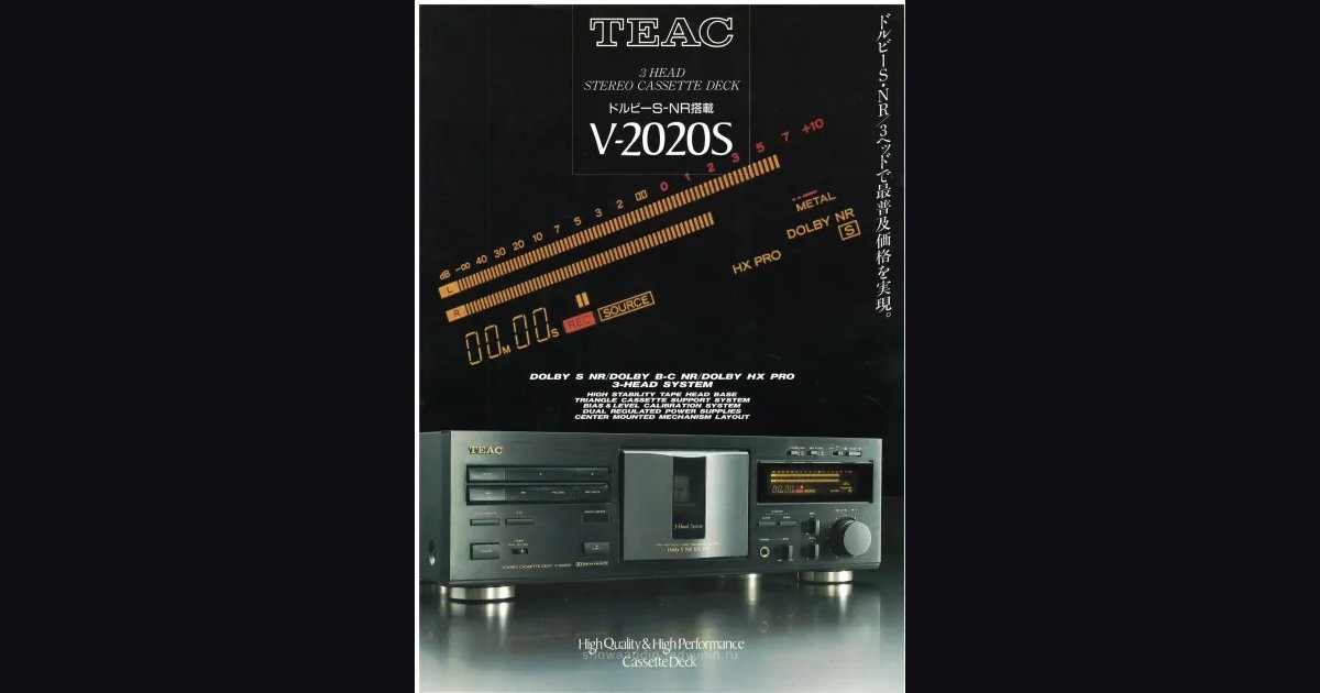 Листовка про трехголовочную кассетную деку TEAC V-2020S, лист А4, февраль 1993. Главная фича - Dolby S NR в связке с Dolby B/C NR и HX Pro, что для деки за ¥55,000 было серьезной заявкой. Механизм с центральным креплением и треугольным прижимом кассеты, два независимых источника питания. На обороте - подробный разворот с техническим описанием и прайс-листом дистрибьютора Nippo Japan.